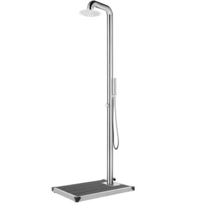 This garden shower featuring a modern design is meant to be a great addition to your swimming pool and other outdoor living areas. This outdoor shower is made of stainless steel, making it weather-resistance. The shower system has a head shower and a hand shower to meet your gardening, watering and quick showering needs. The hand shower features a double-locked flexible hose with a length of 1.5 m. It is also equipped with a brass hand shower holder. The durable and corrosion-resistant shower base is made of premium WPC and framed with stainless steel with a brushed finish, which ensures durability for years of use. It also offers the highest level of hygiene protection, making it ideal for your outdoor space. Thanks to its sturdiness and versatility, the shower tray can serve as a pool ladder base as well. Soak yourself in a truly relaxing shower experience and enjoy the modern style of this outdoor shower system! Base colour: Grey Material: Stainless steel, WPC Overall height: 230