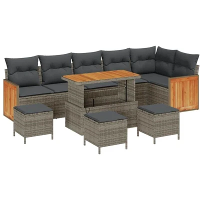 This modular garden sofa set adds a touch of modern elegance to any outdoor terrace or garden, perfectly blending style and functionality. Featuring sleek lines and minimal ornamentation, it's ideal for spaces that emphasize comfort and utility. The set offers flexibility in how it's arranged, catering to your seating needs, whether for intimate gatherings or larger events. With its Poly Rattan structure and exquisite Acacia wood tabletop, it not only provides a comfortable seating experience but also contributes to an aesthetically pleasing outdoor setting. Materials: Composed of resilient Poly Rattan, this sofa set presents an intertwining of modern appeal and timeless utility. Its weather-resistant features ensure it gracefully withstands the sun's rays and seasonal changes. Supplemented by the beautifully finished Solid Acacia wood surface, the set brings a natural yet sophisticated element to your outdoor spaces. Included Components: Equipped with an outdoor cushion tailored from weather-resistant fabric, this sofa set is designed to combat outdoor conditions. The cushion’s removable cover facilitates easy cleaning and maintenance, ensuring a fresh look throughout changing seasons. Robust, powder-coated steel frames provide lasting support, maintaining the structural integrity of your set. Features /Function /Design: The modular design allows you to reconfigure the layout according to your preference or event requirements. This quality extends to the removable and washable seat cushions, making this set versatile and practical for everyday use. Its lightweight construction permits easy adjustments, catering to diverse outdoor arrangements. Recommended Uses: Ideal for spring and summer, this sofa set is tailored for garden and terrace use. Its modular functionality adapts to any arrangement, from cozy family evenings to vibrant outdoor parties. The flexibility creates an inviting ambiance, perfect for entertaining or simply enjoying a quiet moment with nature. Care &Maintenance: For longevity, cover the furniture when not in use, shielding it from harsh weather. The removable covers make upkeep convenient, allowing periodic cleaning without hassle. Minimal straightforward care guarantees enduring beauty and comfort, providing a remarkable outdoor experience year-round.