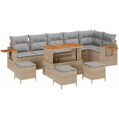 This Modular Garden Sofa Set redefines outdoor relaxation and style. Crafted to embody both elegance and functionality, this set is perfect for the garden or terrace space. Composed of poly rattan, it offers a chic modern style while allowing for modular configurations. The aesthetically pleasing presence of solid acacia wood complements its construction, making it an excellent choice for outdoor leisure and group gatherings. Premium Materials: Constructed from poly rattan, combined with solid acacia wood, creating a visually striking and highly functional assembly. Poly rattan is chosen for its durability and resistance to UV light, making it the perfect option for outdoor furniture. The acacia wood surfaces add a touch of natural beauty, ensuring a long-lasting appeal that stands up to summer's harsh sun. Interchangeable Components: This set includes modular components that can be reconfigured into various layouts, offering flexibility and adaptability to fit any space or occasion. The back and seat cushions come with weather-resistant fabric and are easily removable for washing or replacement, enhancing both functionality and aesthetic appeal. Innovative Features: Every piece of this garden sofa set exemplifies ingenious design. With lightweight construction and a powder-coated steel frame, the furniture is sturdy yet easy to maneuver, ensuring effortless rearrangement according to your preference or need. Versatile Uses: Designed for outdoor use, this sofa set caters to spring and summer lounging needs. It is perfect for enjoying the garden or terrace during gatherings with friends and family. The modern style is characterized by clean lines and minimal ornamentation that naturally enhances various outdoor settings. Effortless Maintenance: To maintain the set's appearance, it's recommended to use protective covers when not in use. The seat cushions have removable and washable covers, allowing for regular cleaning and maintenance. These straightforward care instructions ensure that the furniture remains a lasting fixture in your garden.