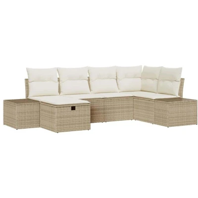 ManoManoGeneral description This Garden Sofa Set is a brilliant addition to any outdoor seating area. With its modern modular design, you can arrange it according to your space. The poly rattan material not only looks good but is also highly durable against the elements, making it perfect for patios, gardens, or balconies. It’s designed for ease of use, combining function and style for a comfortable outdoor experience. Technical specifications Colour: Beige Material: Poly rattan Overall dimensions: 55 x 62 x 69 cm (L x W x H) Number of items: 6 Assembly required: Yes EAN: 8721288408310 SKU: 3360712 Compatibility and accessories 2 x Centre seat including storage function with a water-resistant bag 1 x Corner seat including storage function with a water-resistant bag 2 x Sofa including storage function with a water-resistant bag 1 x Footstool with storage function Usage This sofa set is perfect for creating a welcoming lounge in outdoor areas. Its stylish design fits well with various settings,