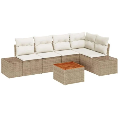 ManoManoGeneral description This trendy outdoor sofa set is a fantastic upgrade for any garden or terrace. With a sleek and versatile look, it is perfect for both cozy catch-ups and larger outdoor gatherings. Made from UV-resistant poly rattan and powder-coated steel, it is strong and weather-resistant. The inviting modular design includes a handy table, creating the ideal spot for food and conversations. Technical specifications Colour: Beige and white Material: PE rattan, powder-coated steel, and solid acacia wood Assembly required: Yes EAN: 8721288369000 SKU: 3356629 Functional Components Each sofa and corner seat features hidden storage with water-resistant bags, perfect for stashing cushions and outdoor items away from the weather. The table's surface is made of sturdy acacia wood, adding a touch of elegance for outdoor dining and relaxation. Modular Features This flexible set can be rearranged to fit any outdoor space, making it ideal for patios, decks, and gardens. Adjustable feet