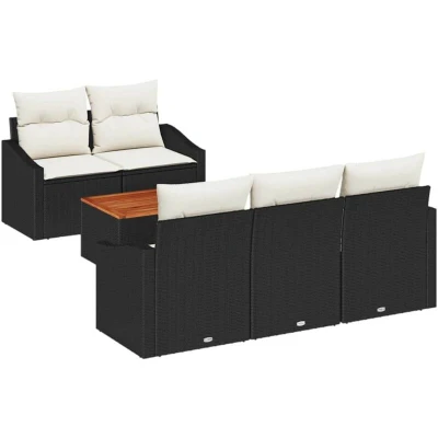 ManoManoGeneral description This trendy outdoor furniture set is perfect for any classy garden or terrace, combining modern simplicity with practicality. Thanks to its modular design, you can rearrange it however you like, adding charm to your space with its woven texture and sleek finish. Great for sunny days, it’s comfortable enough for social gatherings or peaceful moments, made from tough, UV-resistant materials that will last regardless of the weather. Technical specifications Materials: UV-resistant poly rattan, powder-coated steel, solid acacia wood Colour: Black and white Assembly required: Yes Included Components: 1 x Centre seat with storage and a waterproof bag, 4 x Arm sofas with storage bags, 1 x Garden table EAN: 8721288367082 SKU: 3356437 Features / Function / Design Modular design allows for flexible seating arrangements Each piece has adjustable feet for stability on uneven ground Powder-coated finish enhances durability and aesthetic appeal Recommended Uses Ideal for gardens
