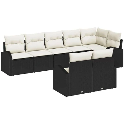 ManoManoGeneral description The Garden Sofa Set with Cushions Poly Rattan is your go-to for outdoor comfort and style, perfect for your garden or terrace. It’s designed for laid-back spring and summer gatherings, hitting that sweet spot between function and modern flair. With clean lines and a smooth woven look, it creates a fabulous setting for lounging or socializing. Built to last outdoors, this set gives you the ultimate chill vibe wrapped in cutting-edge design. Technical specifications Material: Poly rattan Overall dimensions: 289 x 124 x 85 cm (L x W x H) Weight: 42.8 kg Seating area: 55 x 55 cm (W x D) Frame material: Powder-coated steel Indoor / outdoor: Outdoor only Number of items: 8 SKU: 3346087 EAN: 8721158956736 Compatibility and accessories Included Components: 1 x Corner seat 3 x Centre seat 4 x Arm sofa Removable/Replaceable Cushions Usage Recommended Uses: Ideal for gardens and terraces, this sofa provides a flexible sitting option for all sorts of outdoor settings. It