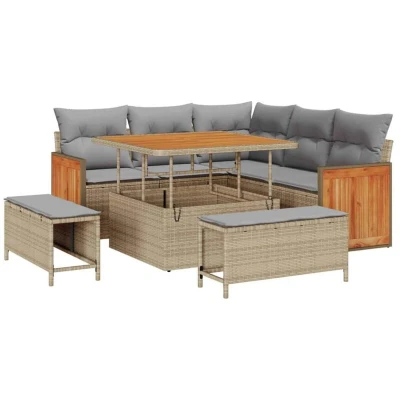 This stylish Garden Sofa Set is a perfect blend of modern design and practical functionality, ideal for transforming any outdoor space. Comprising a set of sofas crafted from durable materials, its simple, clean lines and minimalist appeal make it a timeless addition to gardens and terraces. Relax in style as you enjoy its versatile modularity, allowing you to effortlessly tailor and adapt the layout to your needs while creating a comfortable and inviting atmosphere for family and guests alike. Materials: This elegant garden sofa set features a robust powder-coated steel frame that provides stability and supports the poly rattan weave. The surface made from solid acacia wood not only offers a natural appearance but also enhances the aesthetics and durability. Both materials are carefully selected for their resistance against UV rays, ensuring the set maintains its quality even under direct sunlight. Included Components: The set comes with an outdoor cushion featuring weather-resistant fabric, providing comfort and longevity in any outdoor setting. The cushions boast removable and washable covers, making maintenance easy and user-friendly. These components are thoughtfully included to enhance relaxation and convenience. Features /Function /Design: Embrace modern versatility with this modular design that adapts to your outdoor configuration needs. Light weight lets you move the seating area easily, while the modular capability transforms your living space creatively to suit social gatherings or quiet moments. Recommended Uses: Ideally suited for spring and summer, this sofa set invites you to relax and entertain on terraces and gardens. Whether hosting parties or enjoying personal leisure, its adaptable style suits various outdoor uses and occasions. Care &Maintenance: For optimal longevity, cover the sofa set when not in use and clean the cushions by using the removable covers. Dust off using a dry cloth and avoid harsh chemicals to preserve the furniture's new look over time.