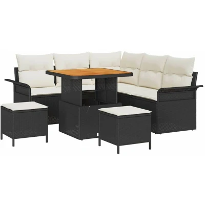 ManoManoGeneral description This Garden Lounge Set is a modern piece that transforms your outdoor space into a comfortable area for relaxation and socializing. With clean lines and a simple aesthetic, it seamlessly fits into any garden or terrace. Made from a combination of Poly Rattan and Solid Acacia wood, the set boasts a classy appearance. Whether you’re enjoying the sun alone or hosting friends, its functional design caters to all your needs. Technical specifications Colour: Black Material: Poly Rattan and Solid Acacia wood Max weight capacity: 845 kg Assembly required: Yes Included components: 2 x Arm sofa, 1 x Corner seat, 2 x Centre seat, 2 x Stool, 1 x Table EAN: 8721288422491 SKU: 3362130 Brand: vidaXL Care & Maintenance Use a cover when not in use, especially during inclement weather. Wipe with a dry cloth occasionally to maintain its appearance and extend its lifespan. Other information