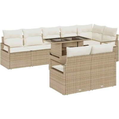 ManoManoGeneral description This versatile Modern Garden Sofa Set will become an impeccable addition to your garden or terrace, offering a stylish setting to relax with family or guests. With a sleek design that epitomizes simplicity and functionality, the set includes multiple configurable components that speak to modern aesthetics while fulfilling various practical needs. Technical specifications Colour: Beige and cream Material: Poly rattan, powder-coated steel, and glass Overall dimensions: 100 x 55 x 73 cm (L x W x H) Weight: 55.7 kg Seating area: 55 x 55 cm (W x D) Indoor / outdoor: Outdoor only Assembly required: Yes Number of items: 9 Compatibility and accessories 1 x Corner seat 3 x Centre seat 4 x Arm sofa 1 x Table Usage Modular Design: Designed with the ability to reconfigure its seating arrangement, this garden sofa set allows you to adapt the layout to fit your space perfectly. Move pieces to create different seating settings—from sprawling layouts for gatherings to compact