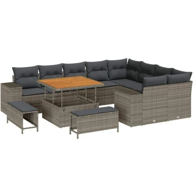 ManoManoGeneral description This Poly Rattan Garden Sofa Set combines modern style with practical comfort, making it ideal for your outdoor space. Whether hosting a summer gathering or relaxing, this set provides a cozy spot with its sleek lines and flexible design, perfect for gardens and terraces. With solid construction and appealing aesthetics, it enhances your outdoor area while ensuring a comfortable lounging experience. Technical specifications Colour: Grey Material: Poly rattan, powder-coated steel, and solid acacia wood Overall dimensions: 100 x 100 x 71 cm (L x W x H) Weight: 79.58 kg Armrest height from seat: 55 cm Seating area: 110 x 55 cm (W x D) Filling material: Foam Indoor / outdoor: Outdoor only Number of items: 12 Assembly required: Yes EAN: 8721288441072 SKU: 3363988 Usage Comfortable seating with soft polyester pillows and foam cushions for relaxed lounging. Adjustable backrest for customizable seating positions. Built-in storage for essentials like garden tools or