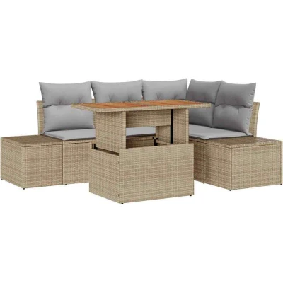 ManoManoGeneral description This garden furniture set is a great choice for outdoor areas, combining style and functionality. It features a cool rectangular design that enhances the ambiance of any garden or terrace. With its clean lines and simple look, this set fits perfectly with modern outdoor spaces. The modular components can be rearranged, making it suitable for everything from cozy get-togethers to large parties. Technical specifications Colour: Beige and grey Material: Poly rattan, powder-coated steel, and solid acacia wood Overall dimensions: 100 x 55 x 73 cm (L x W x H) Weight: 47.8 kg Seating area: 55 x 55 cm (W x D) Frame material: Powder-coated steel Filling material: Foam Includes: 2 x Side sofas with storage, 1 x Corner seat with storage, 1 x Centre seat with storage, 1 x Garden table Number of items: 5 Assembly required: Yes EAN: 8721158230720 SKU: 3349958 Other information