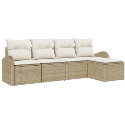 ManoManoGeneral description This Garden Sofa Set with Cushions is a nifty mix of modern style and functionality. Perfect for spring and summer, it spruces up outdoor spaces like gardens and terraces. With its rectangular shape and woven texture, this set adds a bit of elegance while ensuring you have all the comfort for socializing or relaxing. Technical specifications Colour: Beige and white Material: Poly rattan Included Components: 2 x Centre seat, 2 x Arm sofa, 1 x Footstool Assembly required: Yes EAN: 8721288349415 SKU: 3354670 Features / Function / Design Made with poly rattan and powder-coated steel for durability Comfy outdoor cushions made from weather-resistant polyester Adjustable feet for uneven ground Modular design allows for reconfiguration UV-resistant materials maintain color in bright sunlight Care & Maintenance Use outdoor furniture covers when not in use to protect from the elements Store cushions in a dry place for extra protection Other information