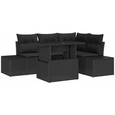 ManoManoGeneral description This Garden Sofa Set transforms any outdoor area into a sophisticated lounge space, offering both style and functionality for your garden and terrace. Featuring a modern rectangular design, this set adapts seamlessly to various occasions from quiet solo moments to lively gatherings. Its adaptable style makes it a focal point in any setting, elevating ordinary outdoor routines into extraordinary experiences. Technical specifications Colour: Black Material: Poly rattan, powder-coated steel, and glass Overall dimensions: 100 x 55 x 73 cm (L x W x H) Weight: 46.1 kg Seating area: 55 x 55 cm (W x D) Seating capacity: 5 Frame material: Powder-coated steel Indoor / outdoor: Outdoor only Assembly required: Yes EAN: 8721158992932 SKU: 3349179 Compatibility and accessories Removable/Replaceable Cushions Delivery contains: 2 x Side sofa including storage function, 1 x Corner seat including storage function, 1 x Centre seat including storage function, 1 x Garden table Number