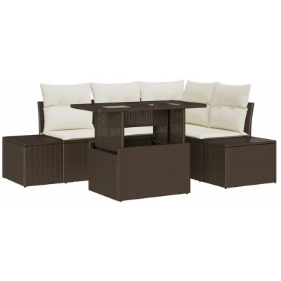 ManoManoGeneral description This Garden Sofa Set transforms any outdoor area into a sophisticated lounge space, offering both style and functionality for your garden and terrace. Featuring a modern rectangular design, this set adapts seamlessly to various occasions from quiet solo moments to lively gatherings. Its adaptable style makes it a focal point in any setting, elevating ordinary outdoor routines into extraordinary experiences. Technical specifications Colour: Brown and cream Material: Poly rattan, powder-coated steel, and glass Overall dimensions: 100 x 55 x 73 cm (L x W x H) Weight: 45.5 kg Seating area: 55 x 55 cm (W x D) Seating capacity: 5 Frame material: Powder-coated steel Indoor / outdoor: Outdoor only Assembly required: Yes EAN: 8721158992888 SKU: 3349174 Compatibility and accessories Delivery contains: 2 x Side sofa including storage function 1 x Corner seat including storage function 1 x Centre seat including storage function 1 x Garden table Number of items: 5