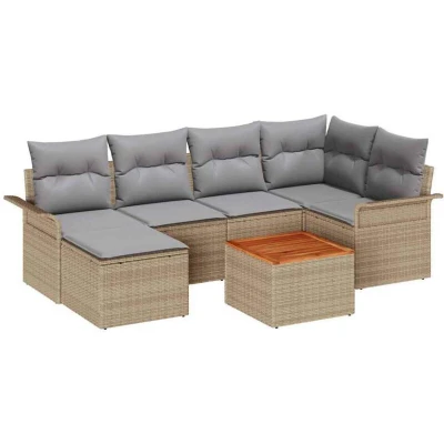 ManoManoGeneral description This Garden Sofa Set is the real deal when it comes to modern style and flexibility. It’s made to spruce up any outdoor area thanks to its smart, trendy design. Since you can rearrange the pieces, it suits all sorts of gatherings, whether you’re lounging about or hosting friends. The mix of poly rattan and solid acacia wood gives it a classy edge, ideal for relaxing in the sun. Technical specifications Colour: Beige and light grey Material: Poly rattan, powder-coated steel, and solid acacia wood Seat width: 110 cm Seat depth: 55 cm Max weight: 110 kg Assembly required: Yes EAN: 8721288362902 SKU: 3356019 Functional Storage Each seat has a handy storage compartment with water-resistant bags, great for stashing cushions, blankets, or any bits and bobs you need. This clever storage setup makes it easy to keep things tidy outside. Built for Comfort The set comes with comfy foam-filled cushions and a supportive poly rattan backrest. The cushions are just right for