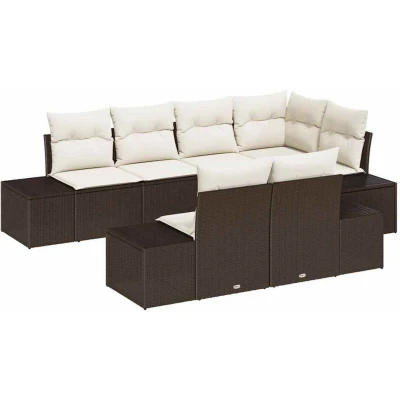 ManoManoGeneral description This Garden Sofa Set with Cushions is a versatile and stylish addition to any garden or terrace. Characterized by its modern, modular design, it offers unparalleled comfort and flexibility. Each piece in the set can be reconfigured to suit differing needs, making it perfect for any occasion. Crafted with woven poly rattan and cushioned with weather-resistant fabric, it's designed specifically to endure outdoor elements. Whether hosting a gathering or enjoying a peaceful afternoon, this set enhances your outdoor living space with elegance and functionality. Technical specifications Colour: Brown and cream Material: Poly rattan Frame: Powder-coated steel Assembly required: Yes EAN: 8721158966841 SKU: 3347098 Compatibility and accessories 1 x Corner seat 2 x Centre seat 4 x Side sofa Other information