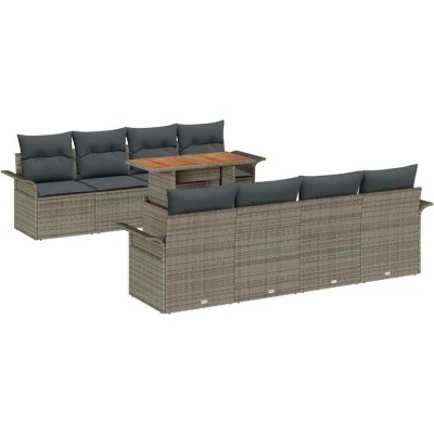 ManoManoGeneral description This outdoor sofa set is designed with modern aesthetics and practicality, providing a comfortable spot for your garden or terrace. Its sleek look blends seamlessly with outdoor spaces, creating a relaxing environment for spring and summer gatherings. The woven texture enhances the leisure vibe, making it ideal for social events where friends can unwind in comfort. Technical specifications Colour: Grey Material: Poly rattan, powder-coated steel, and solid acacia wood Overall dimensions: 100 x 55 x 73 cm (L x W x H) Weight: 53.6 kg Seating area: 220 x 55 cm (W x D) Frame material: Powder-coated steel Indoor / outdoor: Outdoor only Number of items: 7 Assembly required: Yes EAN: 8721158994202 SKU: 3349306 Included Components 2 x 2-seater sofas with storage 1 x Garden table 4 x Centre seat with storage Care & Maintenance Cover the set when not in use to maintain its appearance. Wipe surfaces with a wet cloth for cleaning. Replace cushions as needed to ensure comfort