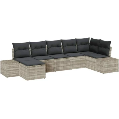 ManoManoGeneral description The Garden Sofa Set with Cushions in light grey poly rattan is a stylish outdoor seating option that showcases a contemporary design and modular setup. Perfect for gardens and terraces, it adds a touch of luxury while providing practicality, making it ideal for gatherings or solo relaxation. Technical specifications Colour: Light grey Material: Poly rattan Back height: 69 cm Assembly required: Yes Delivery contains: 1 x Corner seat 3 x Centre seats 2 x Side sofas 1 x Footstool EAN: 8721288360922 SKU: 3355821 Brand: vidaXL Other information