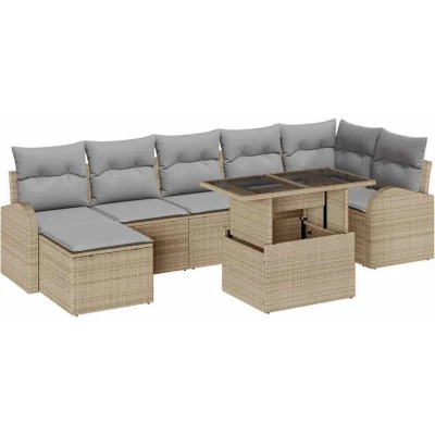ManoManoGeneral description This modern garden sofa set adds a sophisticated touch to any outdoor space, providing both style and utility. Designed for garden and terrace use, the set's sleek lines and minimalistic appeal make it perfect for spring and summer gatherings. Its tasteful design exudes a contemporary ambiance, making it suitable for those who value both appearance and practicality. The set offers a versatile setup, allowing for flexible seating arrangements to suit various gatherings, from intimate family dinners to cheerful garden parties. Technical specifications Colour: Beige and light grey Material: Poly rattan, powder-coated steel, and glass Seat width: 55 cm Seat depth: 55 cm Seating capacity: 8 Assembly required: Yes EAN: 8721158988003 SKU: 3348686 Included Components 1 x Corner seat 3 x Centre seat 2 x Arm sofa 1 x Footstool 1 x Table Features /Function /Design Height-adjustable table transitions from coffee height to dining height. Hidden storage compartments for