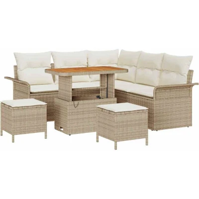 ManoManoGeneral description This Garden Sofa Set is an excellent choice for outdoor seating, combining modern aesthetics with comfortable practicality. Whether placed on your terrace or in a sunny garden corner, it features a simple yet stylish design. Enjoy lazy afternoons or lively gatherings surrounded by the clean lines and neutral colors of this versatile set, which complements any outdoor setting. Technical specifications Colour: Beige and cream Material: Poly rattan, powder-coated steel, and solid acacia wood Overall dimensions: 90 x 55 x 71 cm (L x W x H) Weight: 51.3 kg Armrest height from seat: 55 cm Seating area: 110 x 55 cm (W x D) Filling material: Foam Indoor / outdoor: Outdoor only Assembly required: Yes EAN: 8721288442055 SKU: 3364086 Compatibility and accessories Delivery includes: 2 x Arm sofas with storage function and water-resistant bags 1 x Corner seat with storage function and water-resistant bag 2 x Centre seats with storage function and water-resistant bags 2 x Square