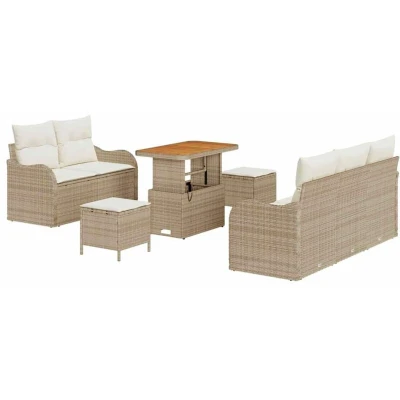 ManoManoGeneral description This garden sofa set combines modern style with comfortable practicality, making it a brilliant addition to your outdoor space. With its modular components, you can create different layouts to suit your needs—perfect for everything from BBQs to lazy afternoons. Made from sturdy materials, the set gives off a warm and inviting vibe, allowing you to relax or enjoy meals outdoors with its smooth lines and soft colors. Technical specifications Colour: Beige and cream Material: Poly rattan, powder-coated steel, and solid acacia wood Overall dimensions: 90 x 55 x 71 cm (L x W x H) Weight: 43.6 kg Armrest height from seat: 55 cm Seating area: 110 x 55 cm (W x D) Filling material: Foam Indoor / outdoor: Outdoor only Number of items: 8 Assembly required: Yes EAN: 8721288442802 SKU: 3364161 Brand: vidaXL Compatibility and accessories 4 x Arm sofa including storage function with a water-resistant bag 1 x Centre seat including storage function with a water-resistant bag 2 x