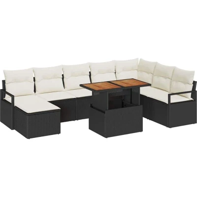 ManoManoGeneral description The Poly Rattan Garden Sofa Set combines clever design with practical elegance, making it an excellent choice for outdoor spaces. Its modern vibe features clean lines and a laid-back style, fitting perfectly in gardens and terraces. Made from durable materials like poly rattan and powder-coated steel, it offers comfort and resilience, ideal for lounging on sunny afternoons or hosting vibrant garden parties. Technical specifications Colour: Black and cream Material: Poly rattan, powder-coated steel, and solid acacia wood Seat width: 55 cm Seat depth: 55 cm Max weight capacity: 110 kg Assembly required: Yes EAN: 8721158998606 SKU: 3349746 Compatibility and accessories Includes: 2 arm sofas (with storage), 1 corner seat (with storage), 4 centre seats (with storage), 1 footstool (with storage), and 1 garden table Installation Assembly is required for this garden sofa set. Detailed instructions are typically included to guide you through the setup process. Usage This