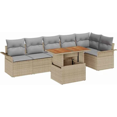 ManoManoGeneral description This modern outdoor seating set is designed for gardens and terraces, focusing on simplicity and practicality. With its clean lines and minimal fuss, it offers a comfy and chic spot to sit. The modular design allows for flexible setup, making it ideal for both social events and quiet afternoons. Technical specifications Colour: Beige and light grey Material: Poly rattan, powder-coated steel, and solid acacia wood Overall dimensions: 100 x 55 x 73 cm (L x W x H) Weight: 56.9 kg Seating area: 55 x 55 cm (W x D) Frame material: Powder-coated steel Indoor / outdoor: Outdoor only Number of items: 7 Assembly required: Yes EAN: 8721158994561 SKU: 3349342 Compatibility and accessories Delivery contains: 2 x Arm sofa including storage function 1 x Corner seat including storage function 3 x Centre seat including storage function 1 x Garden table Usage Perfect for spring and summer outdoor living. Great for decluttering with hidden storage space for cushions, throws, or