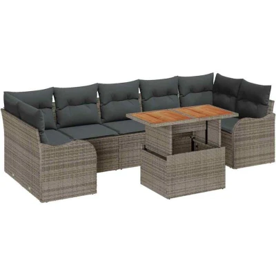 ManoManoGeneral description This Garden Sofa Set strikes the perfect balance between modern style and practical design, making it great for sprucing up any outdoor area. With its smart lines and minimal fuss, it’s all about contemporary vibes, whether you’re hosting a summer bash or just chilling in your garden or on your terrace. It’s made for comfort and a splash of class. Technical specifications Colour: Grey Material: Poly rattan, powder-coated steel, and solid acacia wood Overall dimensions: 100 x 55 x 73 cm (L x W x H) Weight: 66.4 kg Seating area: 55 x 55 cm (W x D) Frame material: Powder-coated steel Indoor / outdoor: Outdoor only Assembly required: Yes EAN: 8721158995391 SKU: 3349425 Included Components 2 x Arm sofas including storage function 2 x Corner seats including storage function 3 x Centre seats including storage function 1 x Garden table Features / Function / Design Made with UV-resistant materials Cushions are removable and covered in weather-resistant fabric for comfy