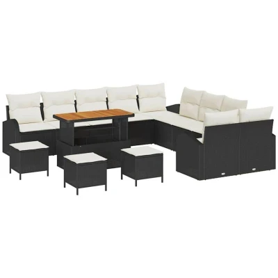 ManoManoGeneral description Give your outdoor space a lift with the Garden Sofa Set, designed for a modern look and practicality. This lovely piece of furniture creates a cozy vibe, focusing on comfort and flexibility. It fits perfectly in any garden or terrace, providing a stylish hangout spot, making it a must-have for summer barbecues. With a smart design and a touch of flair, this set is ready for comfy evenings and sunny afternoons. Technical specifications Colour: Black and cream Material: Poly rattan, steel, and solid acacia wood Overall dimensions: 110 x 55 x 71 cm (L x W x H) Weight: 59 kg Armrest height from seat: 55 cm Seating area: 55 x 55 cm (W x D) Frame material: Powder-coated steel Filling material: Foam Indoor / outdoor: Outdoor only Number of items: 14 Assembly required: Yes EAN: 8721288445292 SKU: 3364410 Included Components 4 x Arm sofa including storage function with a water-resistant bag 6 x Centre seat including storage function with a water-resistant bag 3 x Long Stool