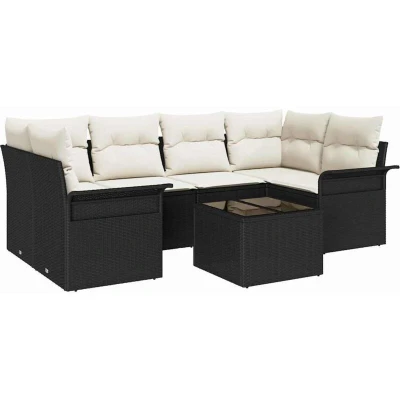 ManoManoGeneral description The Poly Rattan Garden Sofa Set is a stylish and flexible addition to any outdoor space, enhancing your garden or terrace with its sleek and minimalist design. Whether hosting friends or enjoying a quiet moment, this set offers both comfort and style. Its modular design allows for various configurations to suit your space and needs. Technical specifications Colour: Black and cream Material: Poly rattan, steel, and glass Overall dimensions: 55 x 55 x 37 cm (L x W x H) Weight: 47.9 kg Seating area: 110 x 55 cm (W x D) Frame material: Powder-coated steel Filling material: Foam Includes 6 pillows Indoor / outdoor: Outdoor only Assembly required: Yes EAN: 8721288341976 SKU: 3353926 Compatibility and accessories Delivery contains: 2 x Corner seat 2 x Centre seat 2 x Arm sofa 1 x Table Usage To maintain its appearance, cover the set when not in use. For cleaning, a quick wash with soapy water is recommended for any items stored outside. Following these care tips will help