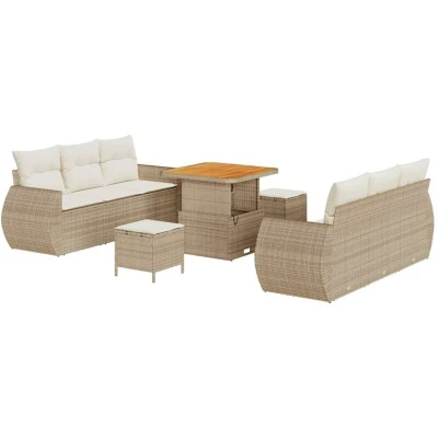 ManoManoGeneral description This stylish garden sofa set is designed to enhance outdoor spaces such as gardens and terraces with its smart and simple design. Made from durable poly rattan and solid acacia wood, it combines lightweight materials with strong steel support, ensuring longevity and resistance to UV rays. The set includes practical features like easy assembly, requiring just two people and a screwdriver. Technical specifications Colour: Beige and cream Material: Poly rattan and powder-coated steel Overall dimensions: 80 x 80 x 71 cm (L x W x H) Weight: 46.2 kg Seating area: 55 x 55 cm (W x D) Frame material: Powder-coated steel Indoor / outdoor: Outdoor only UV-resistant materials Removable/Replaceable Cushions Included Components 4 x Arm sofas with built-in storage and water-resistant bags 2 x Centre seats with built-in storage and water-resistant bags 2 x Square stools 1 x Table with solid acacia wood top Care & Maintenance To maintain its appearance, cover the set when not in
