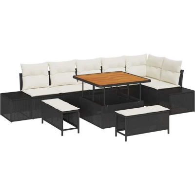ManoManoGeneral description This Garden Sofa Set with Cushions features a modern style characterized by simple, functional, and clean lines. Perfect for outdoor living, this set combines sophistication with practicality for your garden terrace. Its modular design allows you to customize the arrangement to fit your space. Ideal for summer days, the furniture set is made from UV-resistant materials to maintain vibrant colors regardless of the weather. Each piece, from the acacia wood table to the poly rattan seating, is designed to be sleek and polished, making it the centerpiece of any outdoor gathering. Technical specifications Colour: Black and cream Material: Poly rattan and powder-coated steel Overall dimensions: 100 x 100 x 71 cm (L x W x H) Weight: 75.2 kg Seating area: 55 x 55 cm (W x D) Filling material: Foam Indoor / outdoor: Outdoor only Number of items: 9 Assembly required: Yes EAN: 8721288448644 SKU: 3364745 Compatibility and accessories Includes: 2 x Side sofas with storage