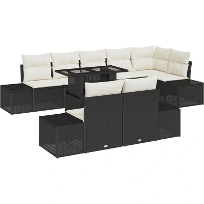 ManoManoGeneral description This smart outdoor furniture set is the perfect add-on for any garden or terrace, mixing functionality and good looks. It's all about modern design with simple lines and no frills, keeping things comfy and breezy. Ideal for spring and summer hangouts, it's a cozy spot for outdoor fun or lazy afternoons. The woven texture and sleek glass tops not only fit in but elevate the vibe, making it a warm and welcoming space. Technical specifications Colour: Black and cream Material: Poly rattan, powder-coated steel, and glass Overall dimensions: 100 x 55 x 73 cm (L x W x H) Weight: 59.4 kg Seating area: 55 x 55 cm (W x D) Indoor / outdoor: Outdoor only Number of items: 9 Assembly required: Yes EAN: 8721158993175 SKU: 3349203 Included Components 4 x Side sofas including storage function 1 x Corner seat including storage function 3 x Centre seats including storage function 1 x Garden table Features / Function / Design UV-resistant materials Removable/Replaceable cushions No