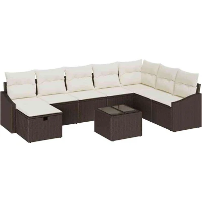 ManoManoGeneral description The Contemporary Modular Outdoor Sofa Set for 8 is a classy addition to any garden or terrace. Its modern design and flexible setup make it perfect for any outdoor environment. Built for comfort and style, the set features a solid pattern, woven texture, and stylish finish—ideal for lazy afternoons with friends. Technical specifications Colour: Brown Material: Poly rattan Finish: Powder-coated Back height: 69 cm Assembly required: Yes EAN: 8721288395405 SKU: 3359337 Compatibility and accessories 4 x Centre seat with storage 1 x Corner seat with storage 2 x Armrest sofas with storage 1 x Footstool with storage 1 x Garden table Usage Weather-proof polyester seat cushions for added comfort. Easy to maintain: Bring cushions inside when it rains, use a cover when not in use, and wipe surfaces with a damp cloth. Other information