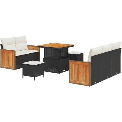 ManoManoGeneral description The Modern Garden Sofa Set offers a stylish seating option for outdoor enthusiasts looking to enhance their spaces with flair and practicality. With its straightforward lines and minimalist design, this set is perfect for outdoor gatherings, relaxing by the pool, or unwinding after a long day. Constructed from durable materials like poly rattan, steel, and wood, it is designed to withstand various weather conditions. Technical specifications Colour: Black Material: Poly rattan Overall dimensions: 80 x 80 x 71 cm (L x W x H) Weight: 46.4 kg Armrest height from seat: 18 cm Seating area: 55 x 55 cm (W x D) Indoor / outdoor: Outdoor only Number of items: 8 Assembly required: Yes EAN: 8721288453143 SKU: 3365195 Brand: vidaXL Compatibility and accessories Includes: 4 x Arm sofas with storage function and water-resistant bags, 1 x Centre seat with storage function and water-resistant bag, 2 x Square stools, 1 x Table Usage Ideal for outdoor gatherings, poolside