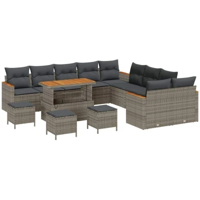 ManoManoGeneral description This Modern Garden Sofa Set is an elegant and flexible addition to your garden or outdoor terrace. With a stylish minimalist design, it fits nicely with any theme, bringing sophistication and function to your space. It’s perfect for summer parties or relaxed spring evenings, featuring clean lines and modular parts that allow you to arrange it as you like. This set creates a warm, inviting vibe, ideal for relaxing or hosting gatherings, striking the right balance between classy and comfortable. Technical specifications Colour: Grey Material: Poly rattan Overall dimensions: 110 x 55 x 71 cm (L x W x H) Weight: 61.3 kg Armrest height from seat: 18 cm Seating area: 55 x 55 cm (W x D) Indoor / outdoor: Outdoor only Number of items: 14 Assembly required: Yes EAN: 8721288451828 SKU: 3365063 Brand: vidaXL Included Components 4 x Arm sofas with storage function and water-resistant bags 6 x Centre seats with storage function and water-resistant bags 3 x Long Stools 1 x Table