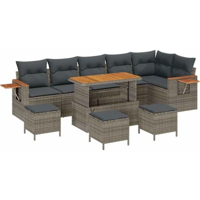 This Modular Garden Sofa Set redefines outdoor relaxation and style. Crafted to embody both elegance and functionality, this set is perfect for the garden or terrace space. Composed of poly rattan, it offers a chic modern style while allowing for modular configurations. The aesthetically pleasing presence of solid acacia wood complements its construction, making it an excellent choice for outdoor leisure and group gatherings. Premium Materials: Constructed from poly rattan, combined with solid acacia wood, creating a visually striking and highly functional assembly. Poly rattan is chosen for its durability and resistance to UV light, making it the perfect option for outdoor furniture. The acacia wood surfaces add a touch of natural beauty, ensuring a long-lasting appeal that stands up to summer's harsh sun. Interchangeable Components: This set includes modular components that can be reconfigured into various layouts, offering flexibility and adaptability to fit any space or occasion. The back and seat cushions come with weather-resistant fabric and are easily removable for washing or replacement, enhancing both functionality and aesthetic appeal. Innovative Features: Every piece of this garden sofa set exemplifies ingenious design. With lightweight construction and a powder-coated steel frame, the furniture is sturdy yet easy to maneuver, ensuring effortless rearrangement according to your preference or need. Versatile Uses: Designed for outdoor use, this sofa set caters to spring and summer lounging needs. It is perfect for enjoying the garden or terrace during gatherings with friends and family. The modern style is characterized by clean lines and minimal ornamentation that naturally enhances various outdoor settings. Effortless Maintenance: To maintain the set's appearance, it's recommended to use protective covers when not in use. The seat cushions have removable and washable covers, allowing for regular cleaning and maintenance. These straightforward care instructions ensure that the furniture remains a lasting fixture in your garden.