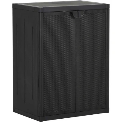 General description This storage cabinet featuring a practical design is a real eye-catcher for your home decor. Made of 100% PP (polypropylene), this storage rack is durable and easy to clean. With 2 shelves, this storage locker provides ample space for organizing and storing your essential items like tissues, laundry detergent, brushes, and more. As a versatile cabinet, this patio cabinet can meet your multipurpose needs. Technical specifications Colour: Black Material: 100% PP (polypropylene) with rattan look Dimensions: 65 x 45 x 88 cm (W x D x H) With 2 shelves Assembly required: Yes Other information Warning: To prevent it from being overturned, this product must be used with the wall attachment device (not provided).