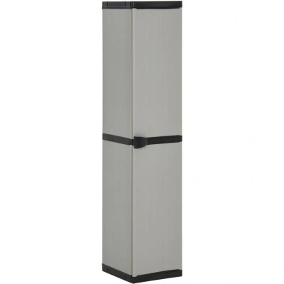 General description This storage cabinet blends into any decor with its timeless design. It is ideal for use in the garden or on the patio. Made of PVC and PP (Polypropylene), this patio cabinet is sturdy, durable, and easy to clean. With 3 shelves, it offers ample storage space to keep your essential items organized and within reach. The compact design maximizes limited space. Technical specifications Colour: Grey and Black Material: PVC, PP (Polypropylene) Dimensions: 34 x 40 x 168 cm (W x D x H) Shelf size: 30 x 35 cm (W x D) Net weight: 5.5 kg Maximum load per shelf: 20 kg With 1 door and 3 shelves Each shelf has a security lock (to immobilize the shelf) Assembly required: Yes Other information Warning: To prevent it from tipping over, this product must be used with the wall attachment device (not provided). Images:
