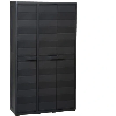 Our high-quality storage cabinet is ideal for organising and storing your household supplies, tools or other items in the garden or on the patio, etc. This cabinet will blend into any decor with its timeless design. This TÜV-GS certified cabinet is made of sturdy, durable polypropylene (PP). The spacious storage cabinet has ventilated shelves which can be adjusted to accommodate items of different sizes. The garden cabinet can be locked with a padlock for added safety (the lock is not included). This outdoor storage cabinet is very easy to clean. The garden cabinet has a compact design and will make the most use of limited space. Assembly is easy. Colour: Black Material: Polypropylene (PP) Dimensions: 97 x 38 x 171 cm (L x W x H) With 3 doors and 4 ventilated, adjustable shelves Each shelf has a security lock (to immobilise the shelf) Sloping top and bottom with drain slots Maximum load capacity per shelf: 12 kg TÜV-GS certificated Lockable with a padlock (not included) Easy assembly
