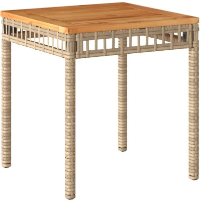 ManoManoGeneral description Gather around this stylish garden table to enjoy a cup of coffee or have a chat with family and friends in your garden, backyard, or on the patio. Its elegant design and durable materials make it a perfect addition to any outdoor space. Technical specifications Dimensions: 38 x 38 x 42 cm (L x W x H) Material: PE rattan, powder-coated steel, solid acacia wood with a natural finish Color: Mix beige and brown UV-resistant Assembly required: Yes Usage This garden table is ideal for outdoor use, providing a stable and easy-to-clean surface for drinks and snacks. The acacia wood top is sturdy and can be easily maintained with a damp cloth. Other information To ensure the longevity of your outdoor furniture, it is recommended to protect it with a waterproof cover.
