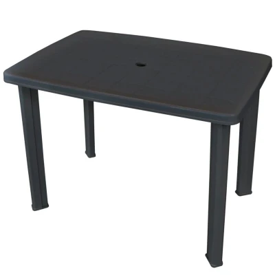 Stylish & Practical Garden Table for Relaxed Outdoor DiningEnjoy relaxed outdoor dining with this stylish and practical garden table. Designed for versatility and comfort, it provides a convenient surface for meals, drinks, or gatherings, making your patio, garden, or camping trips more enjoyable.Practical Umbrella Feature: The table includes a central hole with a 1.4" diameter to accommodate a parasol or garden umbrella, offering shade and keeping you cool while dining outdoors, even on sunny days.Lightweight & Durable Construction: Made from UV-resistant synthetic plastic, the table is easy to move yet strong enough to withstand regular outdoor use. It combines portability with long-lasting reliability for all your outdoor occasions.Comfortable & Spacious Dimensions: Measuring 101x68 cm with a height of 72 cm, this table comfortably seats up to four people. Its thoughtful size provides ample legroom and space for relaxed, casual dining.Easy to Maintain & Stylish: The smooth matte surface wipes clean effortlessly, keeping the table looking neat and contemporary throughout the season. Its anthracite colour complements a variety of outdoor settings with understated elegance.