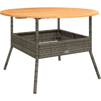 ManoManoGeneral description Gather around this stylish garden table to enjoy coffee or chat with family and friends in your garden, backyard, or patio. The table features a durable acacia wood top and a robust poly rattan frame, making it a perfect addition to your outdoor space. Technical specifications Dimensions: Ø110 x 71 cm (Diameter x Height) Wooden tabletop thickness: 2 cm Material: PE rattan, solid acacia wood with a natural oil finish, powder-coated steel Color: Grey Assembly required: Yes Other information To maintain the beauty of your outdoor furniture, it is recommended to protect it with a waterproof cover.
