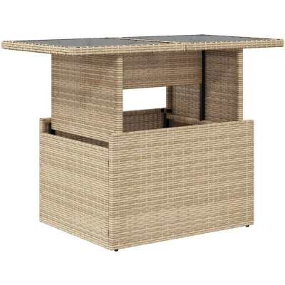 ManoManoGeneral description Gather around this versatile garden table to enjoy a cup of coffee or have a chat with your family and friends in the garden, backyard, or on the patio! The table features a durable design with a glass top, making it an elegant addition to your outdoor space. Technical specifications Colour: Beige Material: PE rattan, powder-coated steel, tempered glass Dimensions: 100 x 55 x 44/73 cm (L x W x H) UV-resistant Plastic adjustable feet Assembly required: Yes Usage The adjustable tabletop can be lifted to transform the table from a coffee table to a dining table, perfect for having guests over or enjoying meals outside. Easy to clean with a damp cloth due to the tempered glass surface. Other information To maintain the beauty of your outdoor furniture, it is recommended to protect it with a waterproof cover.