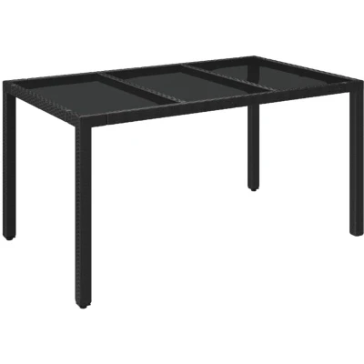 General description This garden table with a glass top features clean and simple lines, making it an excellent choice for your garden, patio, or other outdoor spaces. It combines durability with style, ensuring it will enhance your outdoor experience. Technical specifications Colour: Black Material: PE rattan, powder-coated steel, tempered glass Dimensions: 150 x 90 x 75 cm (W x D x H) Maximum weight capacity: 110 kg per seat Installation Each product comes with an assembly manual in the box for easy assembly. Usage Durable material: Poly rattan is highly resistant and durable in various weather conditions, requiring little maintenance. Stable frame: The powder-coated steel frame ensures sturdiness and stability. Practical tabletop: The tempered glass tabletop is ideal for displaying various essentials and is easy to clean. Water-resistant design: Made of water-resistant material, this table can withstand humidity and rainy weather, and can be easily cleaned with a damp cloth. To