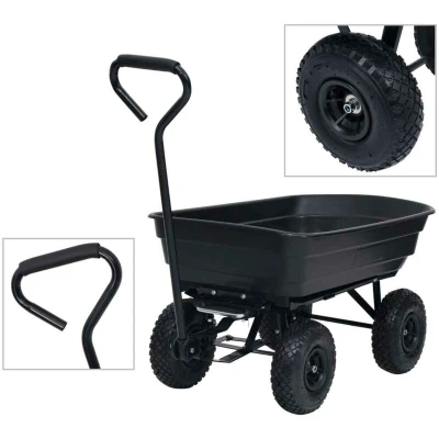 General description The Garden Tipping Hand Cart is designed for a variety of gardening tasks, featuring a durable and robust construction. With a generous storage capacity of 75 L, this cart simplifies the moving and unloading of supplies. It is equipped with heavy-duty air wheels, a versatile pulling handle, and a convenient tipping mechanism for ease of use. Technical specifications Colour: Black Material: Steel, plastic Overall dimensions: 93 x 51 x 50.5 cm (L x W x H) Container dimensions: 93 x 51 x 20 cm (L x W x H) Handle length: 84 cm Wheel diameter: 25.5 cm Loading capacity: 300 kg Volume: 75 L Tipping function: Yes Wheels: PU rubber Assembly required: Yes Usage Before using the cart, ensure that all bolts and connections are tightly in place and that everything is in order. An adult should regularly check the connections. Avoid overloading the cart, and exercise caution when transporting heavy loads, especially when changing directions to prevent tipping. Other information