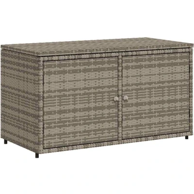 ManoManoGeneral description This garden storage cabinet is perfect for keeping your outdoor furniture cushions, gardening supplies, pool towels, and other items organized and easily accessible. Made from durable PE rattan, also known as poly rattan, this lightweight and low-maintenance material resembles natural rattan while offering weather-resistant properties. Technical specifications Dimensions: 110 x 55 x 60.5 cm (W x D x H) Material: PE rattan, powder-coated steel, stainless steel Max. loading capacity (per shelf): 15 kg Assembly required: Yes Installation To prevent it from being overturned, this product must be used with the provided wall attachment device. Usage This outdoor storage cabinet provides ample space behind the two doors for storing garden tools, pool toys, outdoor cushions, and more. The practical design includes stainless steel door knobs and magnets for easy opening and closing, while the top lid facilitates easy access to your items. Other information Colour: Grey To
