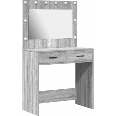 ManoManoGeneral description This modern dressing table in Grey sonoma combines simplicity and functionality, making it a perfect fit for any bedroom style. Its neat design with clean lines exudes understated elegance, ideal for contemporary spaces. The built-in LED lights provide excellent brightness, perfect for tasks like makeup application or hairstyling, giving you a salon-like experience at home. With spacious storage options, it helps keep your personal items organized and easily accessible. Technical specifications Colour: Grey sonoma Material: Engineered wood Overall dimensions: 78.5 x 41 x 135 cm (L x W x H) Weight: 25.7 kg Power source: Plug Number of drawers: 2 Includes: Plane mirror Indoor use only Assembly required: Yes EAN: 8721158850614 SKU: 865033 Brand: vidaXL Other information Use only certified DC 5V input to avoid overheating and potential damage. This product should not be used by children under 14 years or individuals with reduced capabilities. Turn off power while