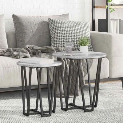 This Engineered Wood Side Table Set embodies the quintessential industrial style, effortlessly blending raw materials with functional design. Ideal for urban loft-inspired living rooms, the set includes two multifunctional tables. Their round shape harmonizes with various furniture arrangements, while the engineered wood surface and metal frame reinforce both durability and contemporary aesthetics. Premium Materials Engineered wood tops patterned with intricate grain designs for an authentic industrial feel. Paired with black metal frames, these tables promise durability and style, suiting both modern and traditional decors. Functional Design The round tables nest seamlessly together, providing versatility in room arrangement. Use separately for lamp lighting or together as a statement piece, adapting easily to various needs. Assembly Required Assembly must be completed by two individuals equipped with a screwdriver. Precise design instructions ensure a straightforward and stable setup. Room Placement Designed specifically for indoor living spaces, these tables fit perfectly beside sofas or chairs, serving as convenient surfaces for drinks, books, or decorative pieces. Maintenance Details Easy to maintain, the tables require only a damp cloth for wiping down. This simple routine keeps their appearance pristine, contributing to lasting allure and functionality.