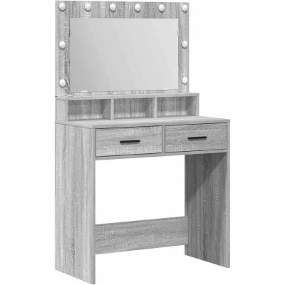ManoManoGeneral description This dressing table is a stylish piece meant for modern bedrooms. It's crafted with a neat, minimalist design that emphasizes simplicity and usefulness. Its rectangular shape and smooth finish make it a lovely focal point, fitting in with various bedroom styles. The built-in LED lights enhance its charm and are very handy, making grooming a breeze. Technical specifications Colour: Grey sonoma Material: Engineered wood Overall dimensions: 79 x 41 x 135 cm (L x W x H) Weight: 26.85 kg Power source: Plug With drawer With plane mirror With shelf Indoor only Assembly required: Yes EAN: 8721158851154 SKU: 865087 Usage The embedded plane mirror allows for easy makeup application and hairstyling. Ample storage options with roomy drawers help keep personal care products and cosmetics organized. Easy to clean; just wipe with a damp cloth to maintain its appearance. Other information Please note to use only certified DC 5V input. Higher voltage may cause overheating and