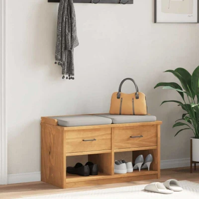 ManoManoGeneral description Create a warm and welcoming environment right next to your door with this wooden hallway bench! Crafted from solid pinewood with an acacia wood finish, this bench showcases the natural beauty of the material, adding rustic charm and vibrant appeal to your space. Its robust and stable construction ensures durability and longevity, making it a perfect addition for both style and function. Technical specifications Material: Solid pinewood, engineered wood Dimensions: 87 x 40 x 50 cm (W x D x H) Max. weight capacity: 110 kg Features: 2 open compartments and 2 drawers Assembly required: Yes Usage This versatile bench doubles as a storage cabinet for shoes and accessories, while also providing a convenient place to sit when putting on or taking off shoes in the hallway. It offers ample space to store clothes, books, shoes, or personal belongings, helping to keep your hallway, entrance space, or other living areas tidy and clutter-free. Other information Warning: To