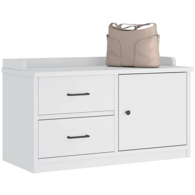 ManoManoGeneral description Create a warm and welcoming environment right next to your door with this wooden hallway bench! Made from robust solid pinewood, this bench is known for its strength and durability, featuring straight grains and distinctive knots that contribute to its rustic charm. It provides ample storage space for clothes, books, shoes, or personal belongings, making it perfect for keeping your hallway or entrance tidy and clutter-free. This multifunctional bench doubles as a storage cabinet for shoes and accessories while offering a convenient place to sit when putting on or taking off shoes. Technical specifications Colour: White Material: Solid pinewood, engineered wood Dimensions: 87 x 40 x 50 cm (W x D x H) Features: 1 compartment and 2 drawers Assembly required: Yes SKU: 4010465 Other information UV varnish provides a vivid, luxurious finish. Easy to maintain: Clean with a damp cloth. Warning: To prevent tipping, use the provided wall attachment device.