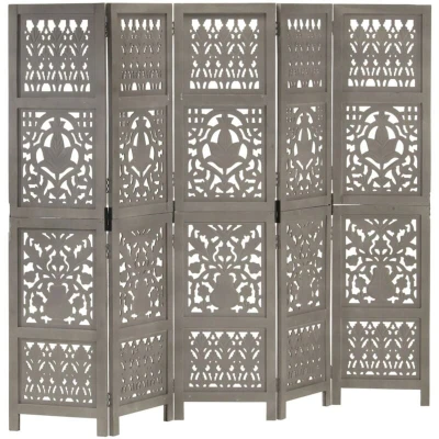 vidaXL Hand carved 5 Panel Room Divider Grey 200x165 cm Solid Mango Wood